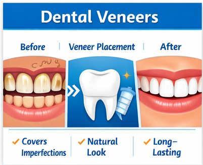Dental veneers are thin porcelain shells bonded to the front surface of teeth. They are ideal for correcting chipped, stained, uneven, or slightly misaligned teeth. Veneers provide a natural appearance and long-lasting results.